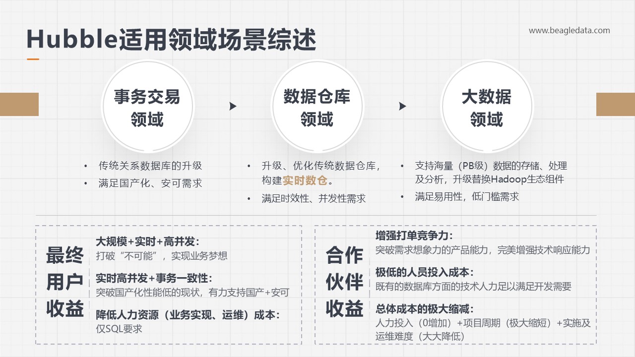目前数据应用主要有三大场景,分布式OLTP,OLAP和Bigdata。这几个场景的迁移转换主要是由于数据应用发展的和数据量不断增大,导致技术架构和解决方案不断变化。