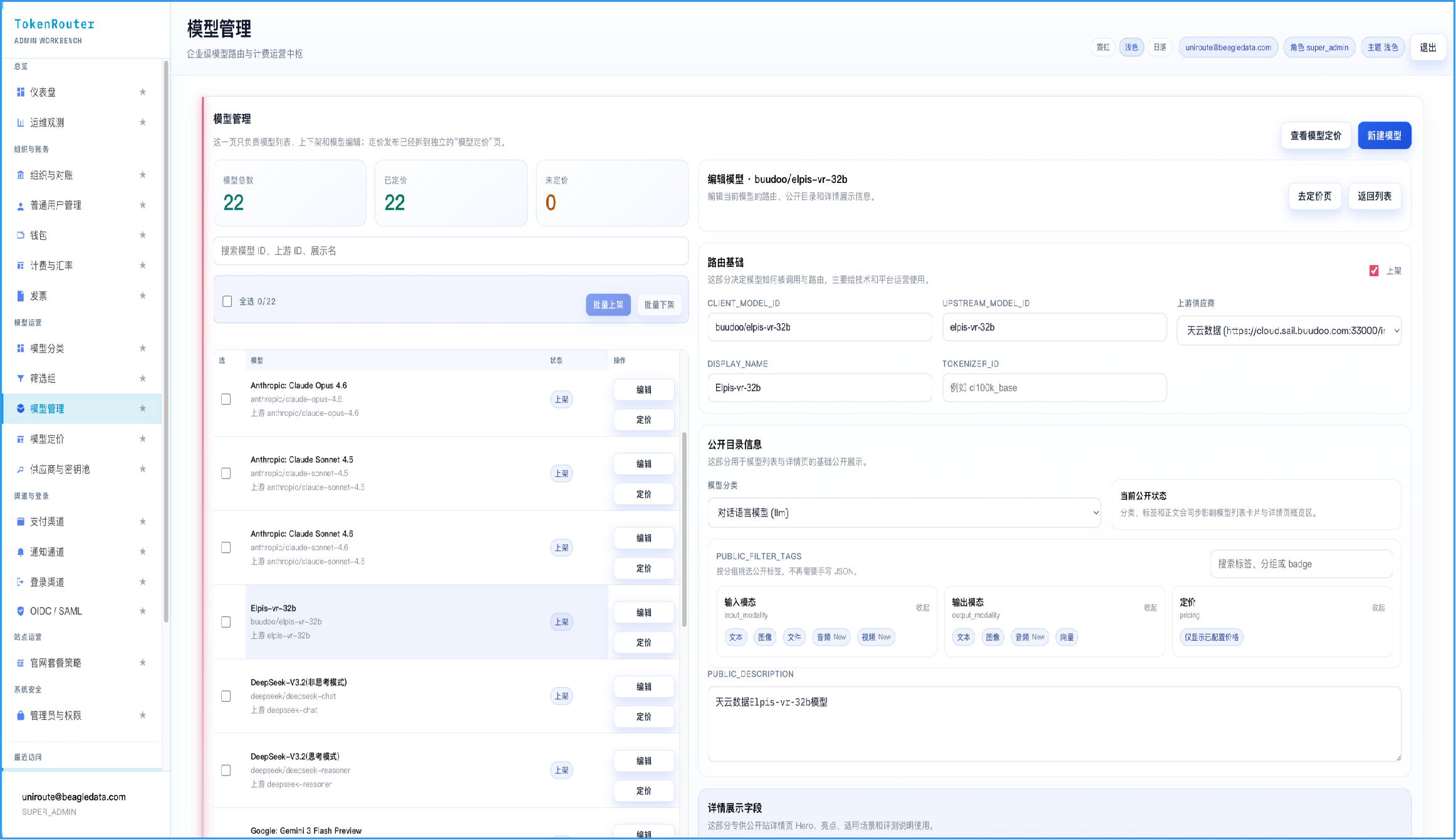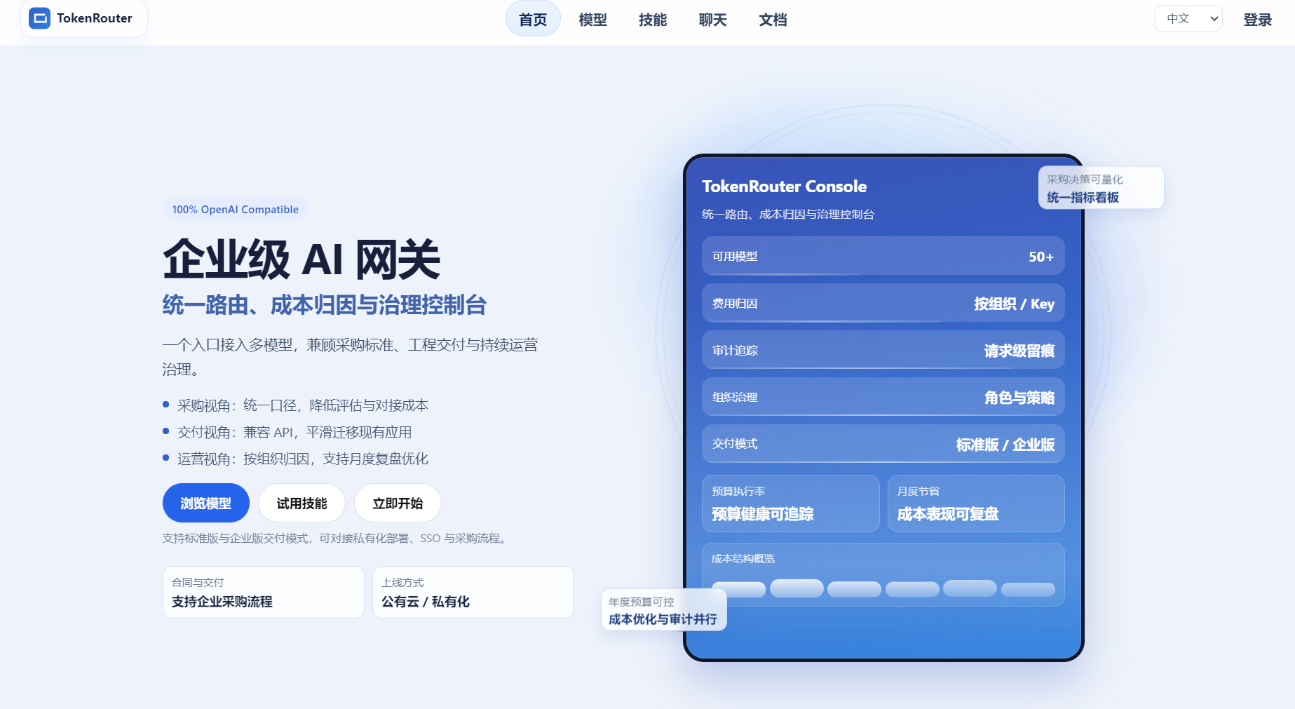 TokenRouter(https://token.buudoo.com/site/)是天云数据TokenFactory核心调度与计费引擎,企业AI算力的智能调度员+统一收银台。采用“路由策略引擎+计费配额系统”双核架构,统一纳管多模型、异构算力,实现智能切流、精准计费、成本最优、业务稳定,让企业AI算力从“粗放消耗”走向“精细化运营”。